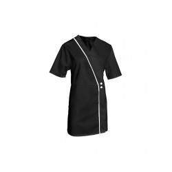 Toile 100% polyester avec effet stretch. Tunique pour esthétique ou spa avec col mao. Manches courtes. Système de boutonnage asymétrique sur le devant avec boutons forme barrette. Fentes latérales. Pli dans le dos pour une meilleure aisance. Coutures princesse. Facile d'entretien.