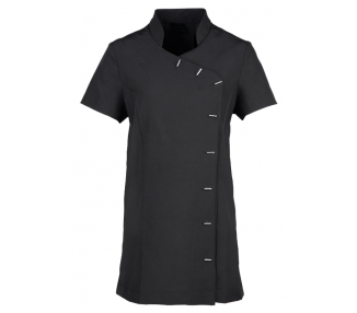 Toile 100% polyester avec effet stretch. Tunique pour esthétique ou spa avec col mao. Manches courtes. Système de boutonnage asymétrique sur le devant avec boutons forme barrette. Fentes latérales. Pli dans le dos pour une meilleure aisance. Coutures princesse. Facile d'entretien.