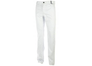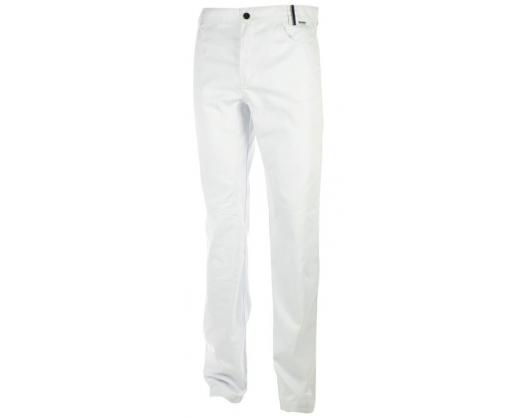 Pantalon ergonomique. Ceinture droite et passant sur le devant gauche avec application de twill en jacquard. Braguette zippée. Bouton rivet. 2 poches cavalières. 1 poche ticket. 2 poches revolver. Réhausse dos. Empiècement d'aisance à l'entrejambe. Broderie directe "LAFONT + bleu/blanc/rouge" sur bas de poche revolver droite. (A environ 2 cm du bas de la poche)