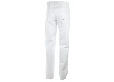 Pantalon ergonomique. Ceinture droite et passant sur le devant gauche avec application de twill en jacquard. Braguette zippée. Bouton rivet. 2 poches cavalières. 1 poche ticket. 2 poches revolver. Réhausse dos. Empiècement d'aisance à l'entrejambe. Broderie directe "LAFONT + bleu/blanc/rouge" sur bas de poche revolver droite. (A environ 2 cm du bas de la poche)