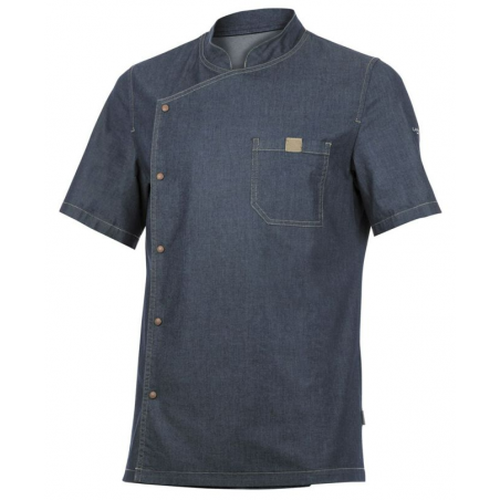 Veste homme croisée en jean manches courtes. Fermeture milieu devant avec 5 grippers avec calotte effet bois. Une poche poitrine gauche plaquée avec un angle biseauté. Tresse beige en application sur l'ouverture du poignet, le haut de poche poitrine et l'encolure dos. Col officier. Broderie directe "LAFONT + bleu/blanc/rouge" sur haut de manche gauche.