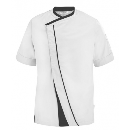 Veste homme croisée, fermée par grippers cachés. Double empiècement milieu devant avec angle bas contrasté et biais contrasté sur toute la hauteur. Style double col avec twill en jacquard sur hauteur milieu dos du col. Œillets d'aération brodés à l'emmanchure. Fentes côtés renforcées par un twill en jacquard. Manches longues avec poignets rapportés à contraste intérieur. Broderie directe "LAFONT + bleu/blanc/rouge" sur bas de manche gauche.