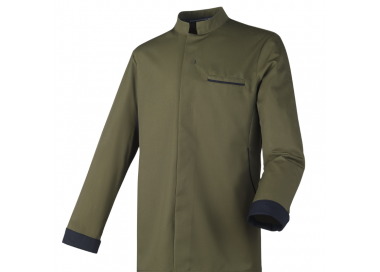 Boutons pressions cachés Empiècement maille sous bras Poche poitrine passepoilée Passepoil découpes côtés et liseré contrastés Revers bas de manches